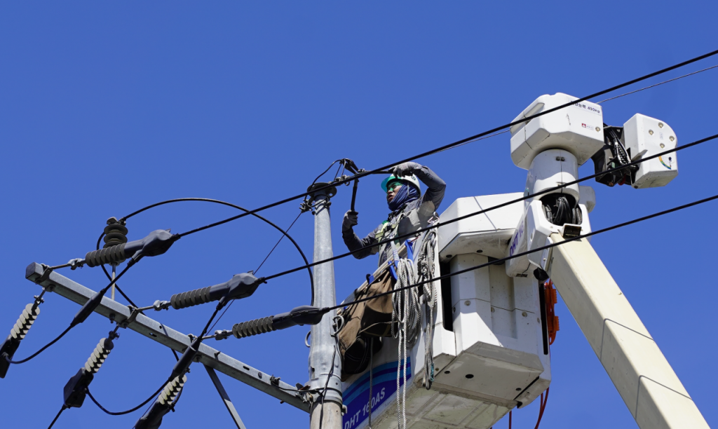 강한 햇빛 아래 전신주 전선 교체 작업을 수행하는 노동자들. 송보현 기자