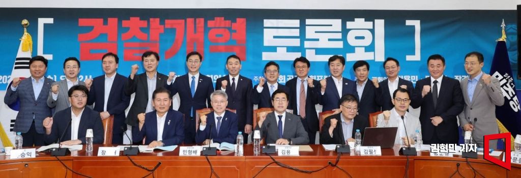 2일 국회에서 열린 더불어민주당 검찰개혁토론회에서 당대표 후보인 정청래·박찬대 의원과 토론회 주최자인 민형배, 김용민, 장경태 의원 등 참석자들이 기념촬영 하고 있다.