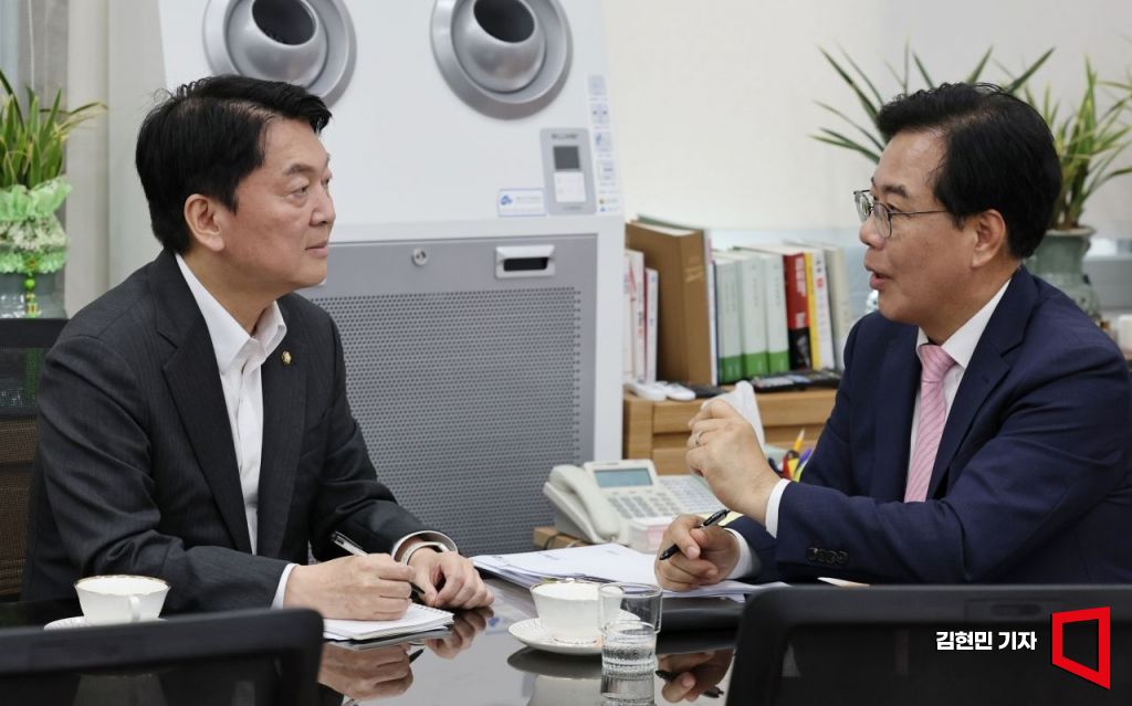 송언석 국민의힘 비대위원장(오른쪽)과 안철수 혁신위원장이 2일 국회 국민의힘 원내대표실에서 만나 대화하고 있다.