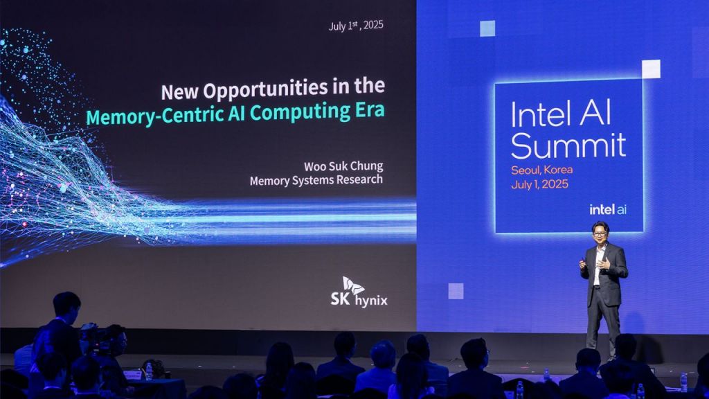 정우석 SK하이닉스 부사장이 지난 1일 서울 강남구 그랜드 인터콘티넨탈 파르나스에서 열린 '2025 인텔 인공지능(AI) 서밋 서울'에서 기조연설하고 있다. 사진=SK하이닉스