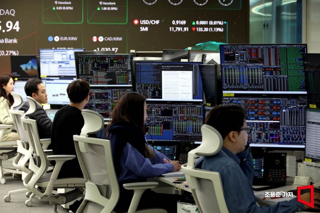 서울 중구 하나은행 딜링룸 직원들이 업무를 보고 있다. 조용준 기자