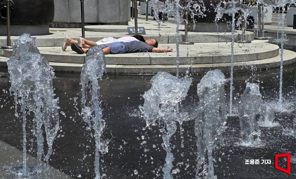 서울 종로구 광화문광장 분수대를 찾은 아이들이 물놀이를 즐기고 있다.