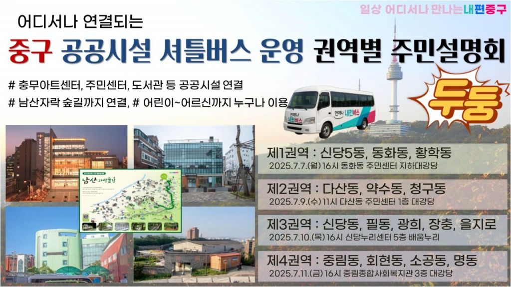 시범운행에 앞서 ‘찾아가는 주민 설명회’도 연다. 설명회는 총 4개 권역으로 나눠 오는 7일 동화동주민센터(신당5동·동화동·황학동)를 시작으로, 9일 다산동주민센터(다산동·약수동·청구동), 10일 신당누리센터(필동·광희동·장충동·을지로동·신당동), 11일 중림동주민센터(소공동·회현동·명동·중림동)에서 순차적으로 열린다.
