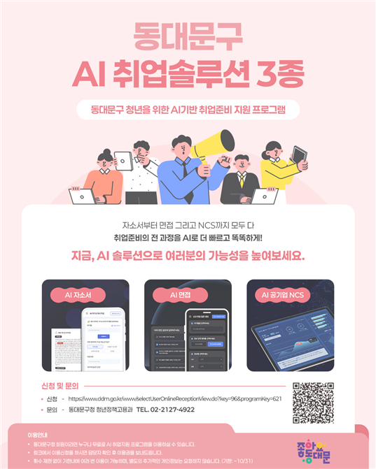 서울 동대문구가 지역 청년들의 구직 경쟁력 향상을 위해 관내 19~39세 청년을 대상으로 ‘AI 취업 솔루션 3종’을 운영한다.