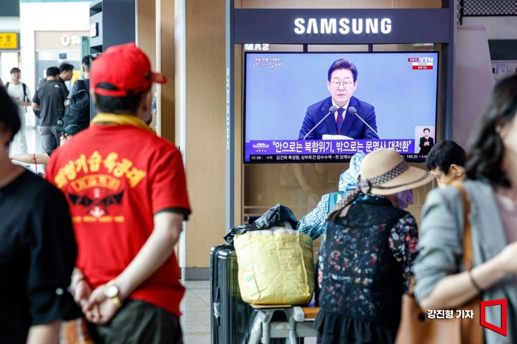 3일 서울 중구 서울역 대합실에서 시민들이 이재명 대통령 취임 30일 기자회견을 보고 있다.