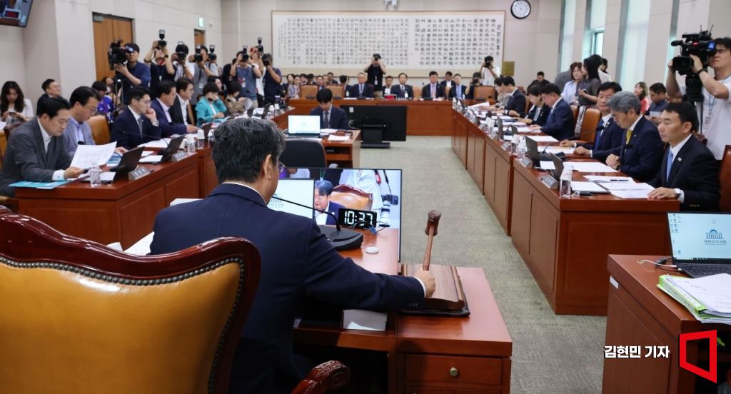 이춘석 국회 법제사법위원회 위원장이 3일 국회에서 열린 법사위 전체회의에서 의사봉을 두드리고 있다.