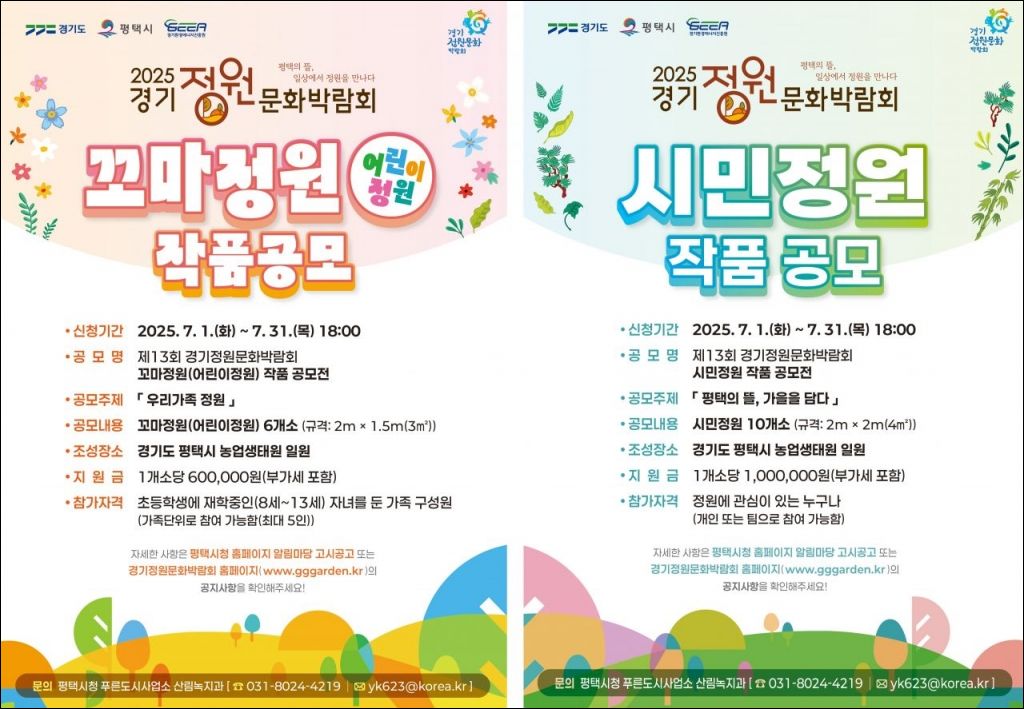 경기도 평택시는 오는 10월 개최 예정인 '제13회 경기정원문화박람회'의 시민정원과 꼬마정원(어린이정원) 공모를 31일까지 접수한다.