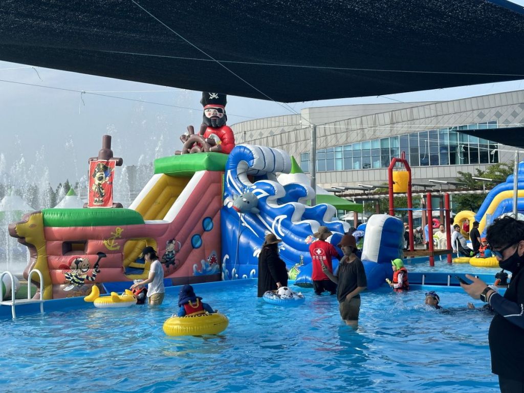 광주과학관 야외 물과학체험장에서 어린이들이 대형 에어바운스와 물놀이 시설을 즐기고 있다.