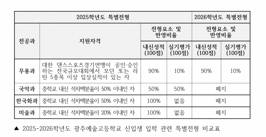 광주시교육청은 최근 고교 입학전형 위원회를 열고 광주예고를 포함한 관내 고교의 2026학년도 입학전형을 승인했다. 이로써 광주예고는 무용과(댄스스포츠)를 제외한 국악과·한국화과·미술과에서 성적 우수자 특별전형을 폐지했다.
