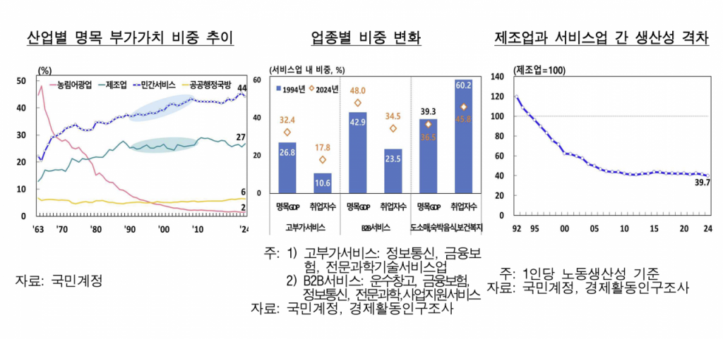 국내 서비스 산업의 1인당 노동생산성이 지난 20년간 제조업의 40%에 수준에 머무는 등 크게 낮은 것으로 나타났다. 그동안 제조업을 보조하는 역할로 인식하고, 내수와 공공 부문에만 의존한 결과다. 특히 코로나19 팬데믹(세계적 대유행) 이후 생산성은 이전 추세를 크게 밑돌고 있다. 서비스업을 제조업과 융합해 수출하는 등 전략 산업화하기 위해 법·제도 정비부터 이뤄져야 한다는 분석이다.