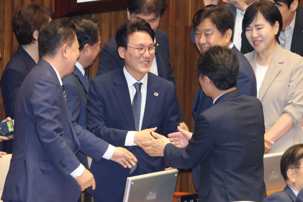 김민석 국무총리 후보자가 3일 국회에서 열린 본회의에서 임명동의안이 통과된 뒤 동료 의원들로부터 축하 받고 있다. 김현민 기자