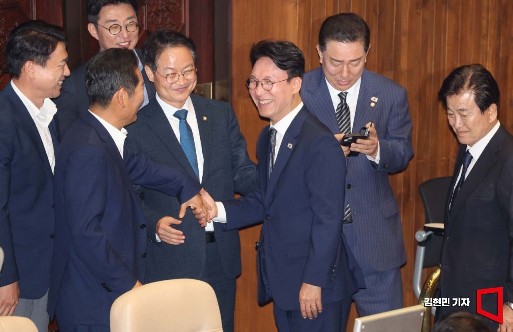 [포토] 동료 의원들과 인사하는 김민석 총리 후보자