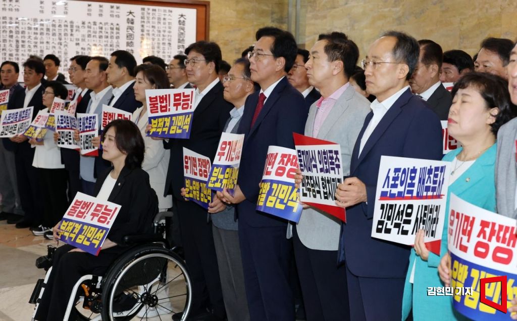 송언석 비상대책위원장 겸 원내대표를 비롯한 국민의힘 의원들이 3일 본회의가 열린 국회 본회의장 앞에서 김민석 국무총리 후보자 임명동의안 표결에 불참한 뒤 규탄 피케팅을 하고 있다.