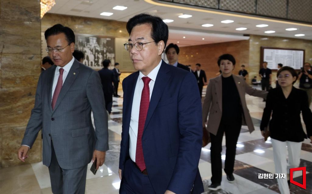 송언석 국민의힘 비상대책위원장 겸 원내대표가 3일 국회에서 열린 비공개 의원총회에 참석하고 있다.