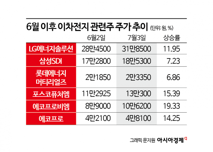 4일 한국거래소에 따르면 LG에너지솔루션은 전날 31만8500원에 거래를 마쳤다. 6월2일 종가 대비 11.95% 상승이다. 같은 기간 삼성SDI는 7.23% 오른 18만5300원을 기록했다. 에코프로비엠과 에코프로도 각각 19.33%, 14.25% 뛰었다.