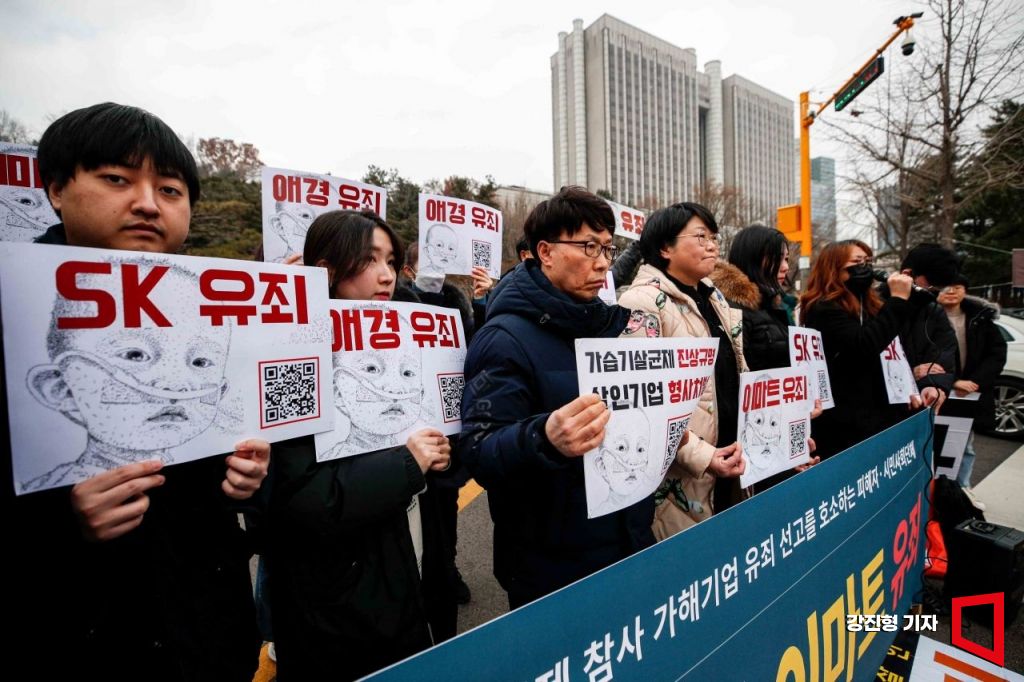 11일 서울 서초구 법원 삼거리에서 가습기살균제 피해자 및 피해자 유가족을 비롯한 시민사회단체 관계자들이 가습기 살균제 관련 항소심 선고공판을 마친 뒤 기자회견 하고 있다. 사진=강진형 기자aymsdream@