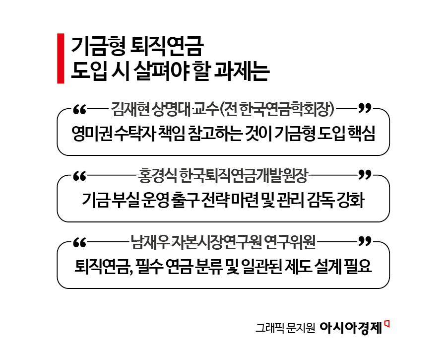 기금형 퇴직연금을 도입하면 현행 퇴직연금 제도의 구조적 한계를 개선할 전환점이 될 수 있다는 평가가 나온다. 다만 도입 자체가 곧바로 수익률 향상과 노후 소득 보장 강화로 이어지는 것은 아니다. 기금형 도입을 위한 법안 마련과 함께 제도를 뒷받침할 장치를 마련해야 한다. 수탁자 책임과 수급권 보호를 강화하면서 장기 운용 기반 등을 닦아야 한다는 게 전문가 조언이다.