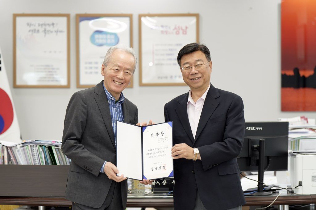 신상진 성남시장(오른쪽)이 3일 오후 시청 집무실에서 금난새 지휘자에게 성남물빛정원 음악홀 명예 예술감독 위촉장을 수여하고 기념촬영을 하고 있다. 성남시 제공