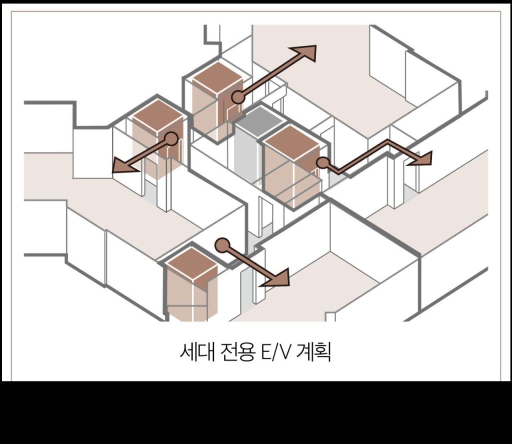 한 층에 4가구가 있다면 엘리베이터를 평균 4개 이상을 확보했다는 얘기로 주로 한남동 등 고급빌라에 적용하는 설계다. 전용 84타입 이상 모든 평형은 현관문 바로 앞 엘리베이터를 전용으로 쓸 수 있는 구조다. 대형 평형은 지하 1층과 지상 1층 엘리베이터홀 자체를 단독으로 쓸 수 있도록 분리했다. 사생활 보호를 중시하는 최근 경향을 반영했다.