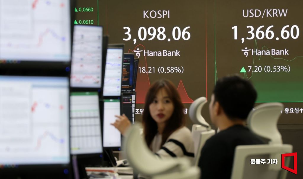 상승 출발한 코스피가 외국인과 기관 매도세에 3100선을 내주며 공방을 이어가고 있는 4일 서울 중구 하나은행 딜링룸 지수 현황판에 코스피와 코스닥, 환율 정보가 표시되고 있다. 2025.07.04 윤동주 기자