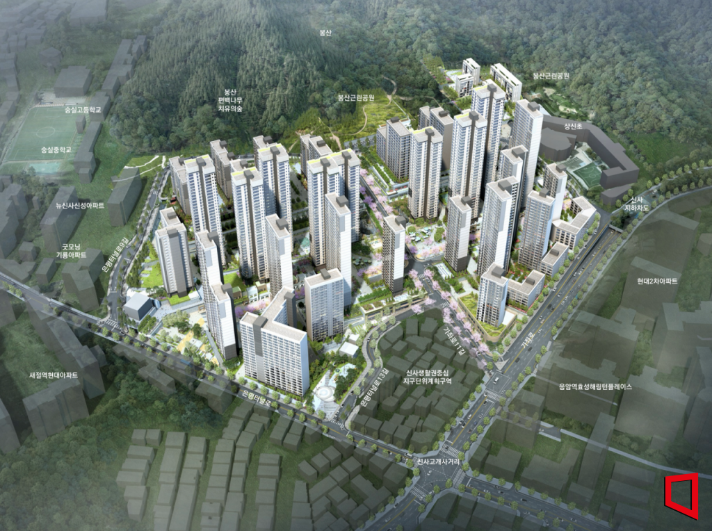 산새마을(신사동 237 일대)에는 용적률 257%를 적용받아 최고 33층, 1360가구(임대 193가구 포함)가 건립된다. 서측 근린공원에는 연면적 3167㎡ 규모의 체육시설(수영장, 헬스장, GX룸)을 설치해 주민을 위한 운동, 휴식공간을 마련했다. 이밖에도 근린공원(4512㎡), 공공공지(294㎡) 등 기반시설을 확충한다.