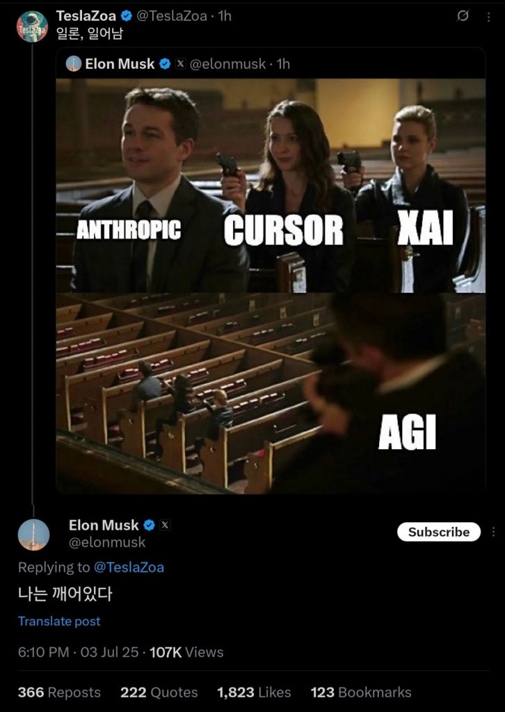 일론 머스크 테슬라 최고경영자(CEO)가 자신의 사회관계망서비스(SNS)에 한국어로 "나는 깨어있다"는 게시글을 올려 화제다. 3일(현지시간) 머스크 CEO는 엑스(X·옛 트위터)에 인공지능(AI) 경쟁 구도를 풍자한 밈(meme·온라인 유행 콘텐츠) 사진 한 장을 올렸다. 해당 이미지는 미국 드라마 '퍼슨 오브 인터레스트'의 한 장면을 편집해 만든 것으로, AI 스타트업 앤트로픽(Anthropic), 커서(cursor), 머스크가 이끄는 xAI가 차례로 뒤에서 총구를 겨누고, 이들을 멀리서 조준하고 있는 인공일반지능(AGI)의 모습이 담겼다. 한 누리꾼이 이 사진에 "일론, 일어남"이라는 게시글을 올리자, 머스크 CEO는 "나는 깨어있다"고 한국어로 답글을 올렸다.