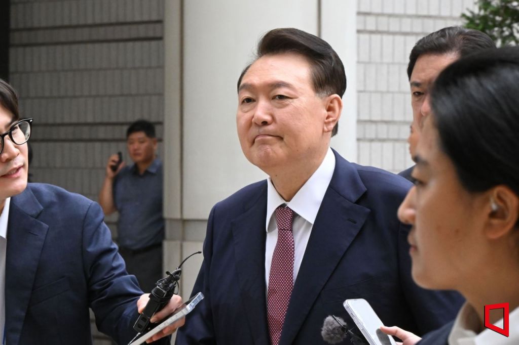 윤석열 전 대통령이 3일 서울 서초구 서울중앙지방법원에서 열린 우두머리 혐의·직권남용 권리행사 방해 혐의 사건 9차 공판에 출석하고 있다.
