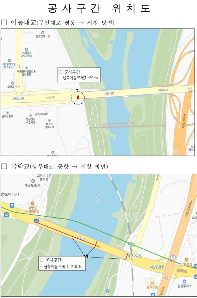 이번 공사는 교량구조 안정성과 통행 안전을 확보하기 위해 추진하는 것으로, 앞서 중차량 통행에 따른 반복 하중으로 신축이음장치 기능이 저하됨에 따라 소음·진동과 구조물 손상 등이 우려된 바 있다.