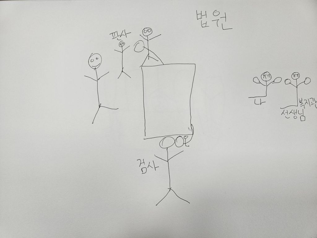 현우씨 시선에서 본 수사와 재판의 모습. 지난 7월 3일 선고 직후 현우씨에게 수사와 재판 과정이 어땠냐고 묻자 현우씨가 직접 그린 그림이다. 실제 이 사건 경찰 조사 단계에서 신뢰관계인의 동석 신청권이 보장되지 않아, 재판부는 피의자신문조서의 증거능력을 기각했다.