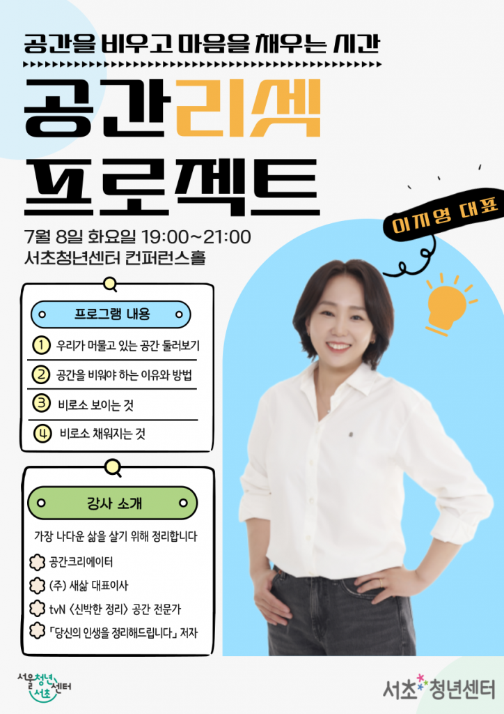 첫 강연은 오는 8일 오후 7시, tvN '신박한 정리'로 잘 알려진 이지영 ㈜새삶 대표가 진행하는 '공간 리셋 프로젝트'가 진행된다. 청년들이 스스로의 공간을 가꿀 수 있도록 돕고, 단순한 정리를 넘어 마음을 정돈하는 공간 관리법을 제시한다.