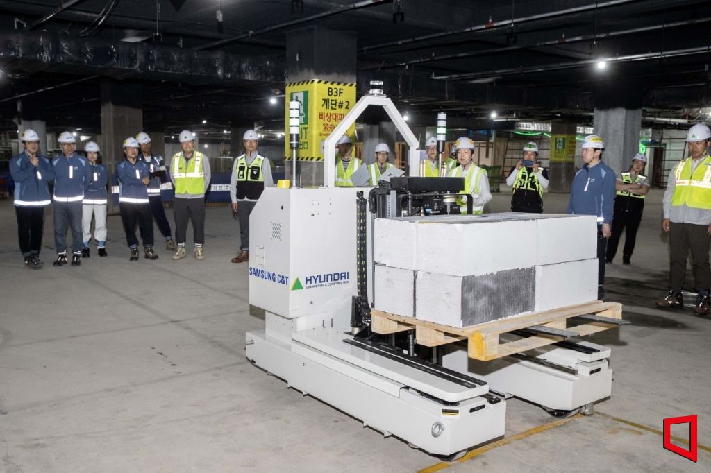 삼성물산과 현대건설이 공동 개발한 '스마트 자재 운반 로봇'이 현장에서 자재를 싣고 이동하고 있다. 삼성물산, 현대건설 제공