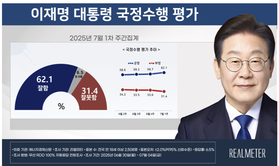 7일 리얼미터가 공개한 여론조사(에너지경제신문 의뢰로 지난달 30일부터 이달 4일까지 전국 18세 이상 2508명을 대상으로 무선 100% 자동응답 방식, 표본오차는 95% 신뢰수준에서 ±2.0%포인트)에 따르면 이 대통령의 국정수행 평가는 지난주보다 2.4%포인트 오른 62.1%를 기록했다. 부정평가는 2.2%포인트 떨어진 31.4%로 나타났다.