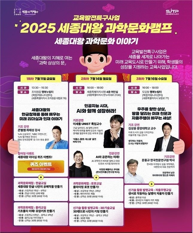 7일 세종시에 따르면 1회차는 11일 조치원읍 행복누림터에서 세종대왕의 한글 창제를 통해 배우는 미래 리더십과 인재 이야기를 주제로 별별 한국사 최태성 연구소장이 특별 강연이 펼쳐진다. 한글 공예 활동과 유압 원리를 응용한 물리 교실 등 과학문화체험 활동도 함께 운영한다.