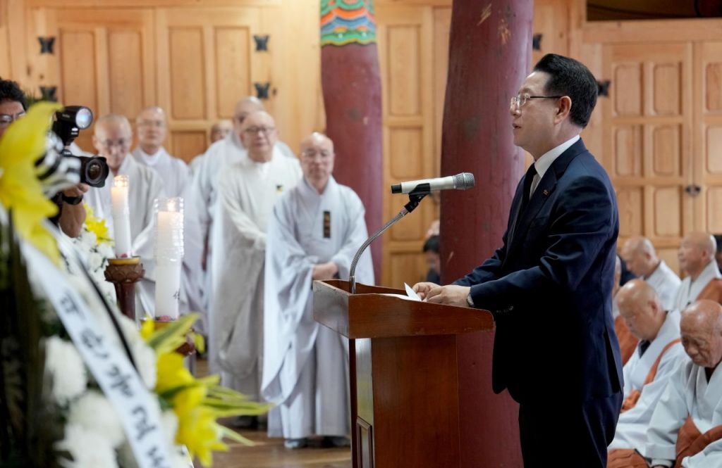 김영록 전라남도지사가 7일 오전 영광 불갑사 취암당 만당 종사 영결식에 참석해 조사를 하고 있다. 전남도 제공