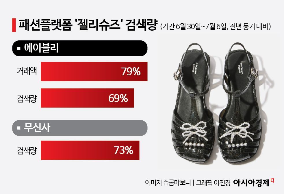 8일 패션플랫폼 에이블리에 따르면 지난 30일부터 지난 6일까지 젤리슈즈의 거래액은 79%, 검색량은 69% 폭증했다. 무신사에서도 같은 기간 젤리슈즈 검색량은 전년 동기대비 73% 증가했다.