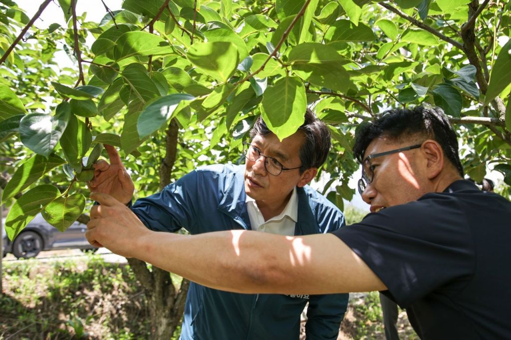 우승희 영암군수가 지난 4일 금정면 대봉감 피해 현장을 확인하고 있다. 영암군 제공