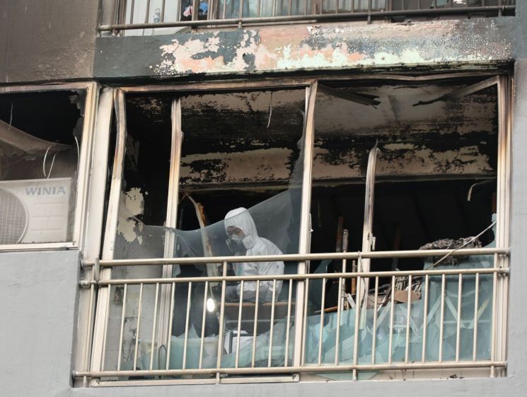 지난 24일 부산 진구의 아파트 화재 현장에서 소방당국과 경찰 등 관계 기관이 합동감식을 벌이고 있는 모습. 연합뉴스