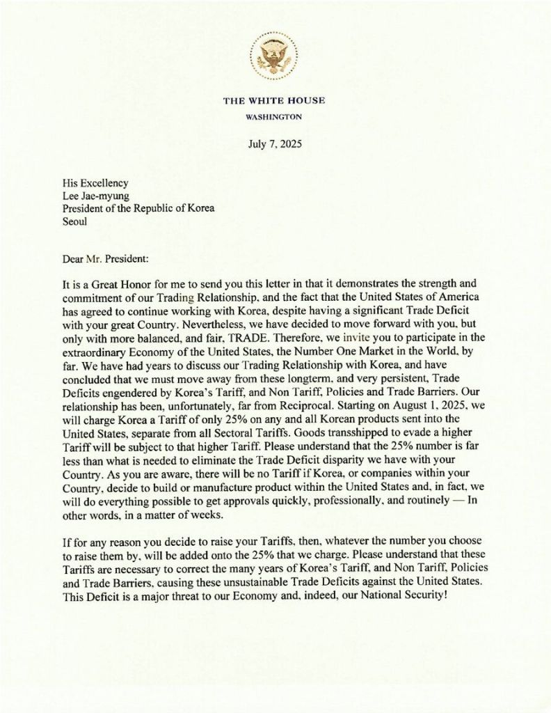 트럼프 대통령은 이날 자신이 만든 사회관계망서비스(SNS) 트루스소셜을 통해 이재명 대통령 앞으로 보낸 공식 서한을 공개하며 "현재 우리의 관계는 상호주의와는 거리가 멀다"며 "우리는 2025년 8월1일부터 미국으로 보내지는 모든 한국산 제품에 단지 25%의 관세만 부과할 것"이라고 말했다.