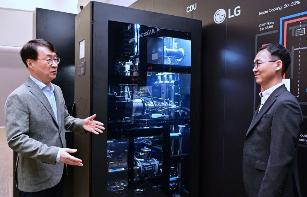 8일 서울 강서구 LG사이언스파크에서 열린 기자간담회에서 이재성 LG전자 ES사업본부장(부사장·왼쪽)이 AI 데이터센터 액체냉각 솔루션인 냉각수 분배 장치(CDU)를 살펴보고 있다. LG전자