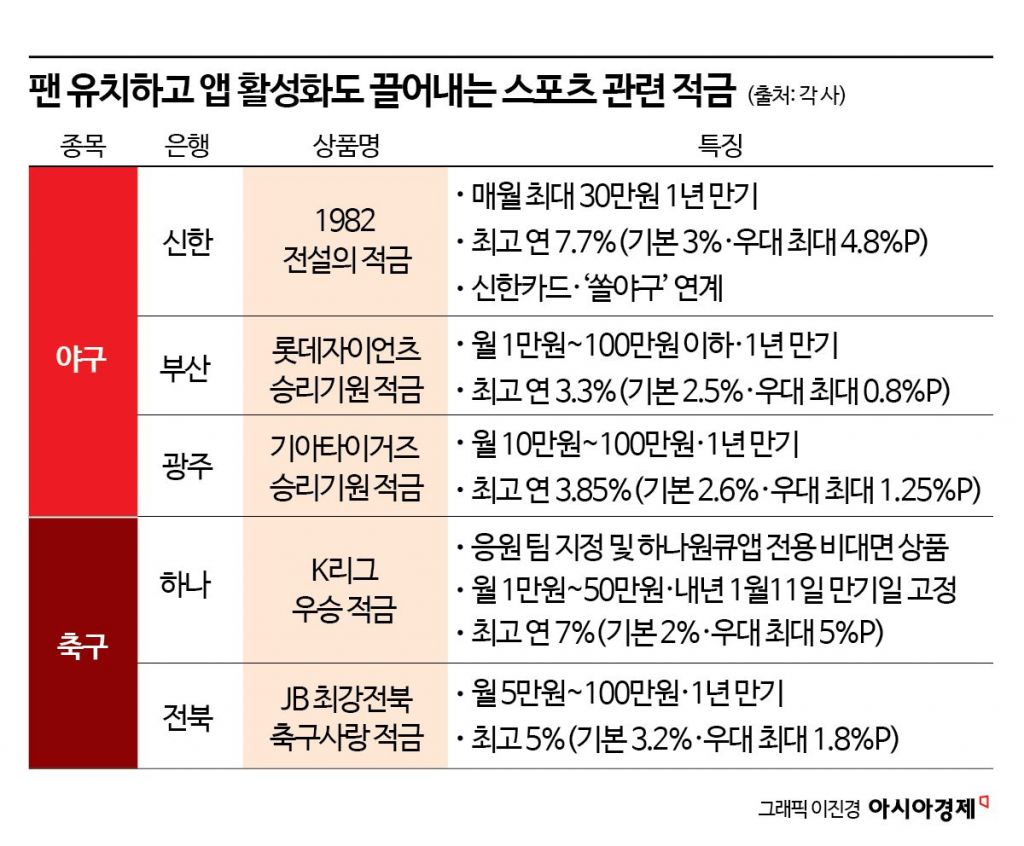 은행들이 스포츠 팬 유치를 위해 적금 상품을 내놓고 있다. 한국프로야구(KBO)와 K리그 등 대표적인 종목에서 각자 응원하는 팀의 우승을 기원하는 마음을 담은 우승 적금이 대표적이다. 비대면 전용으로 상품을 내놓으면서 자사 뱅킹 애플리케이션(앱)으로도 고객을 유도하고 있다.