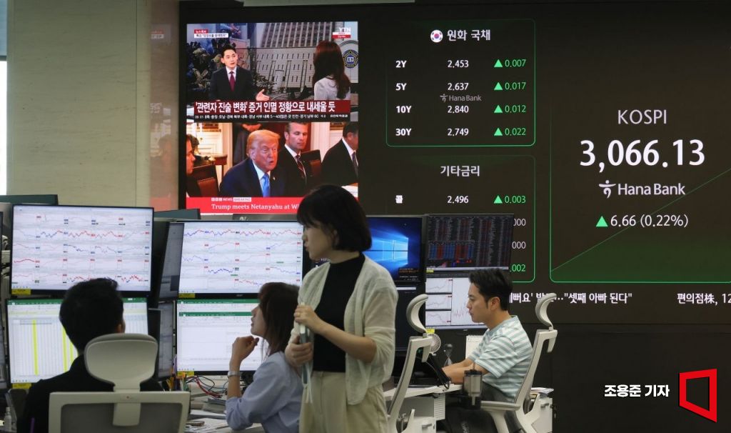 트럼프 미국대통령이 한국, 일본을 포함해 각국을 상대로 상호관세 서한을 발송하면서 무역 정책 불확실성이 커진 8일 서울 중구 하나은행 딜링룸 모니터에 코스피 지수가 표시돼 있다. 이날 코스피는 전장보다 12.27포인트(0.40%) 오른 3,071.74로 시작했다.