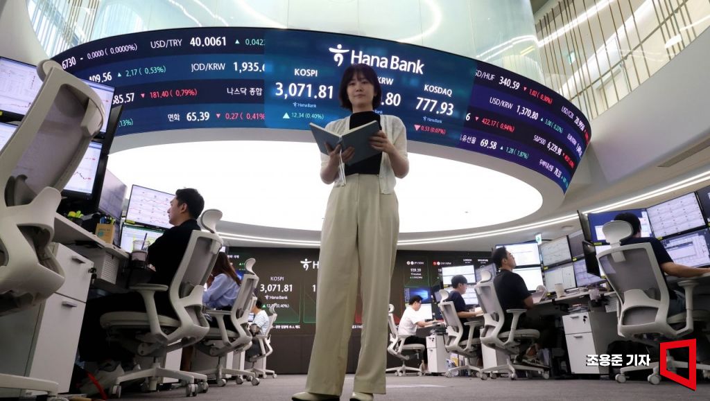 트럼프 미국대통령이 한국, 일본을 포함해 각국을 상대로 상호관세 서한을 발송하면서 무역 정책 불확실성이 커진 8일 서울 중구 하나은행 딜링룸 모니터에 코스피 지수가 표시돼 있다. 이날 코스피는 전장보다 12.27포인트(0.40%) 오른 3,071.74로 시작했다.
