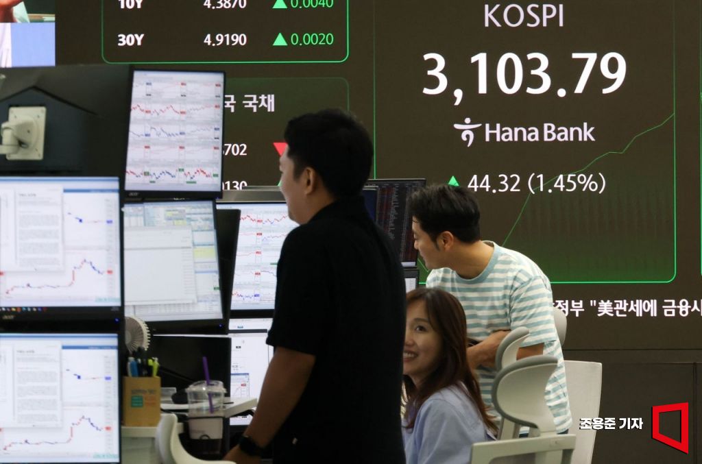 트럼프 미국대통령이 한국, 일본을 포함해 각국을 상대로 상호관세 서한을 발송하면서 무역 정책 불확실성이 커진 8일 서울 중구 하나은행 딜링룸 모니터에 코스피 지수가 표시돼 있다. 이날 코스피는 전장보다 12.27포인트(0.40%) 오른 3,071.74로 시작해 3,100선을 회복했다.