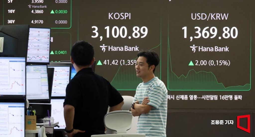 트럼프 미국대통령이 한국, 일본을 포함해 각국을 상대로 상호관세 서한을 발송하면서 무역 정책 불확실성이 커진 8일 서울 중구 하나은행 딜링룸 모니터에 코스피 지수가 표시돼 있다. 이날 코스피는 전장보다 12.27포인트(0.40%) 오른 3,071.74로 시작해 3,100선을 회복했다.