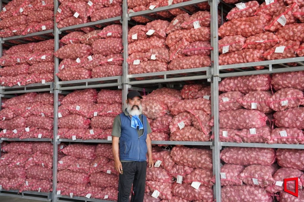수확한 마늘을 흐뭇하게 바라보는 염만규 공주유황꽃마늘생산자협의회 회장