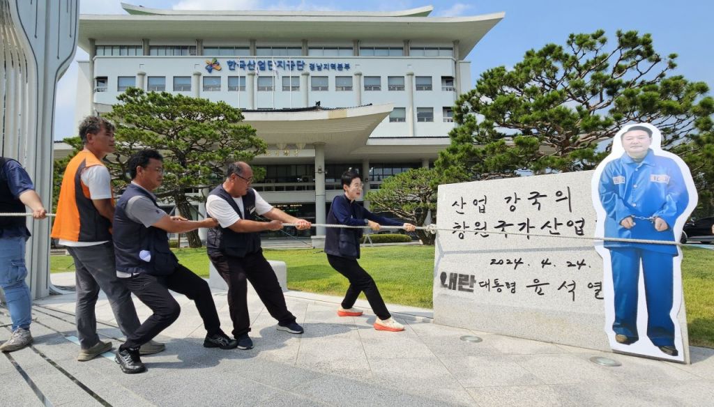 전국민주노동조합총연맹 경남지역본부가 한국산업단지공단 경남지역본부 앞마당에 설치된 윤석열 전 대통령 친필 휘호 표지석 철거를 재차 촉구했다.