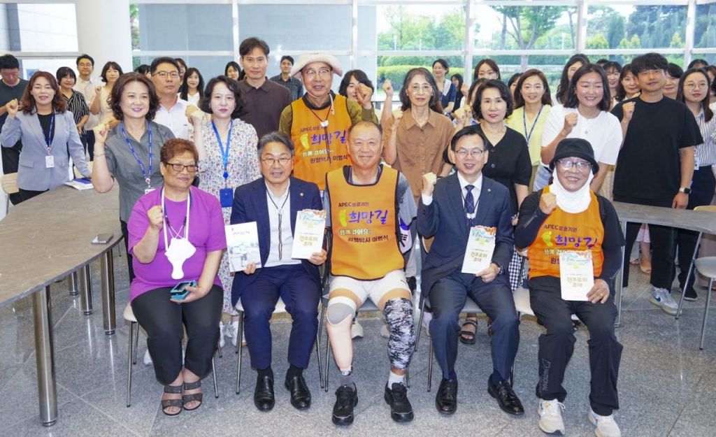 강기정 광주시장이 8일 오전 시청 1층 열린문화공간에서 '2025 경주 APEC(아시아태평양경제협력체) 성공 개최'를 기원하며 왼발 도보 종주에 나선 이범식(60·경북 경산) 씨를 만나 성공 종주를 응원하고 있다. 이 씨는 이날 광주시청에서 출발해 오는 27일까지 21일간 경주까지 400km를 걸으며 APEC 성공개최를 기원하고, 동서 지역간 화합 메시지를 전달한다. 광주시 제공