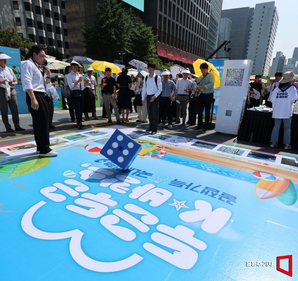 한국경제인협회 주최로 8일 서울 청계광장에서 열린 국내 여행 활성화를 위한 'K-바캉스 캠페인'에 참석한 참가자들이 주사위 놀이를 통해 가고 싶은 국내여행지를 뽑고 있다.