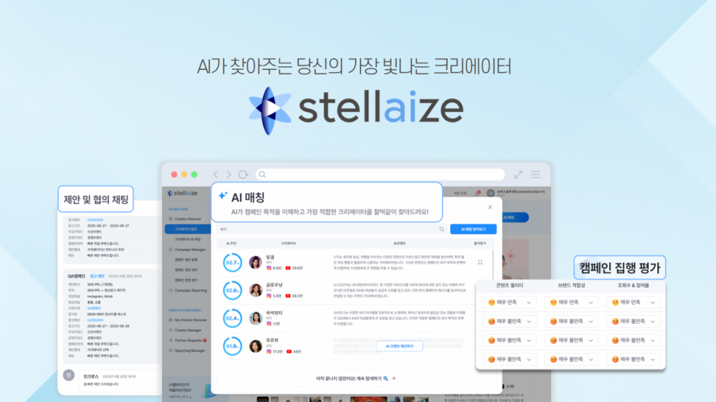 스텔라이즈는 광고주가 콘텐츠 마케팅 캠페인 기획부터 실행, 성과 측정까지 한 번에 처리할 수 있도록 설계된 PPL 플랫폼이다. 광고주는 크리에이터 탐색, AI 매칭, 협업 커뮤니케이션, 콘텐츠 모니터링 및 자동 리포트 생성, 계약까지 전 과정을 원스톱으로 진행할 수 있다.