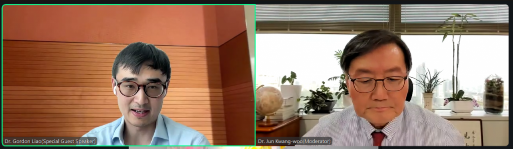 고든 리아오(Gordon Liao·왼쪽) 서클 수석 이코노미스트가 8일 전광우 세계경제연구원 이사장(오른쪽)과 웨비나에서 대담하고 있다.